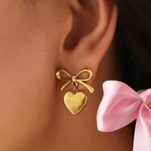 Golden Heart Drop Earrings with Elegant Bow Design