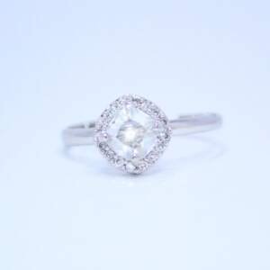 - Stunning cushion-cut centerpiece with a halo of accent stones