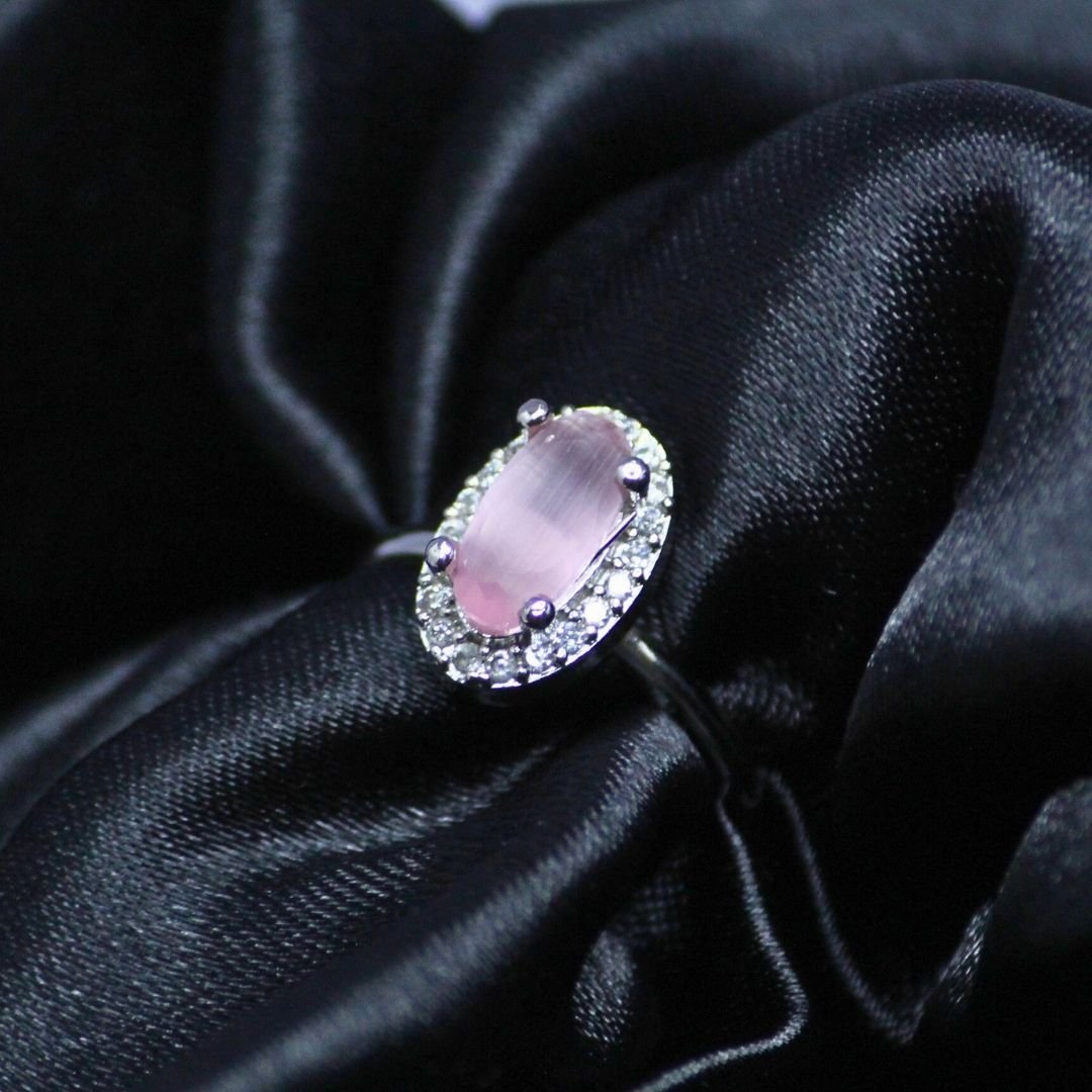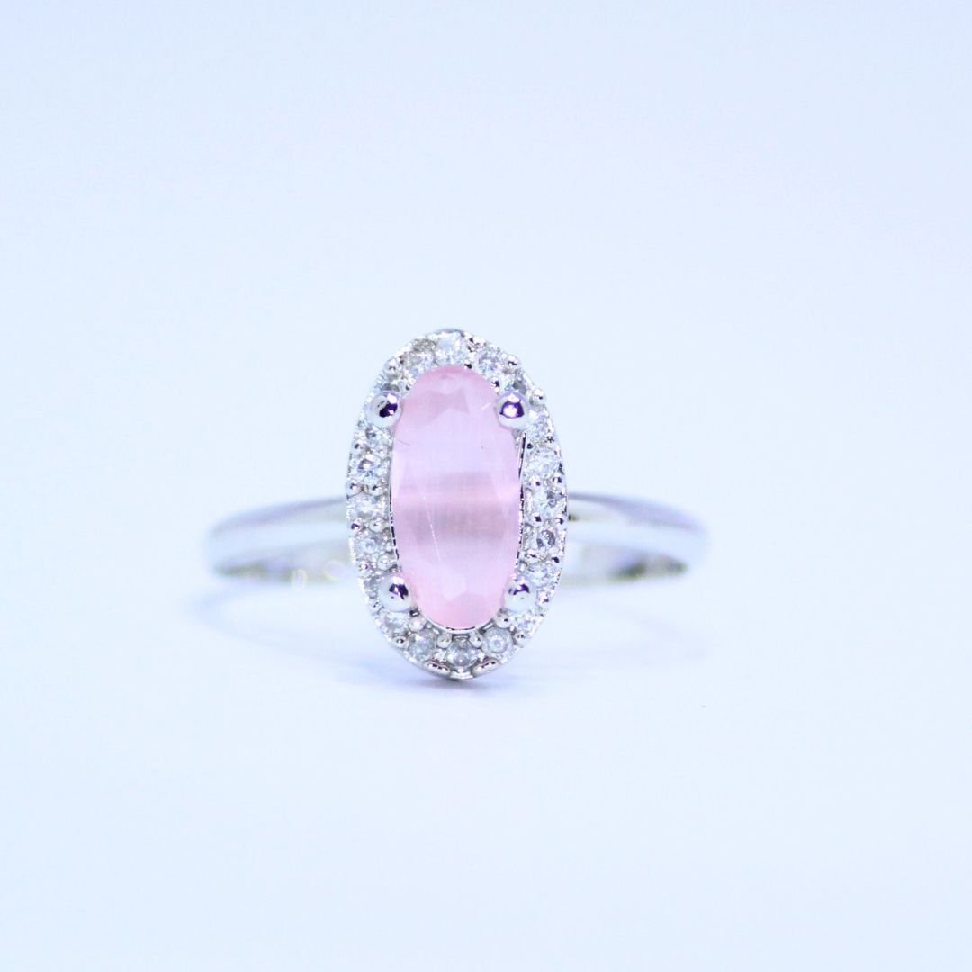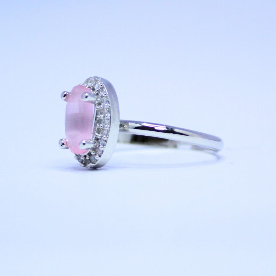 Discover a blend of elegance and sophistication with our stunning Rose Quartz Oval Cut Silver Ring. The soft pink hue of the stone, beautifully cut in an oval shape, radiates a serene charm. Encased in polished !8K white gold tone and surrounded by a halo of dazzling accents, this ring is a refined addition to any jewellery collection. Whether for a special occasion or adding a touch of grace to everyday wear, this piece promises to captivate with its understated beauty.