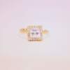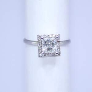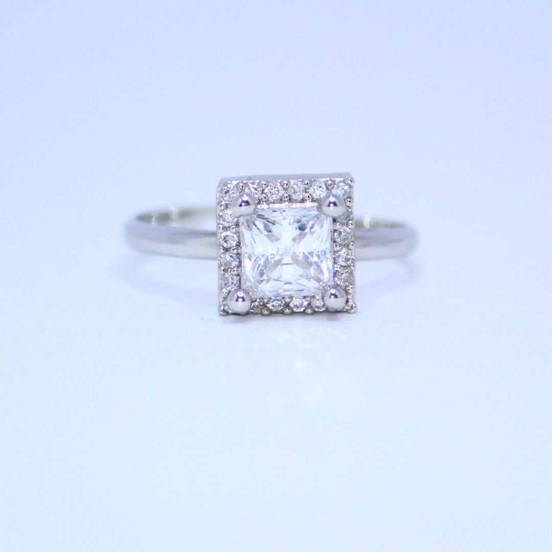 A radiant princess-cut halo ring set in a sleek silver band, designed for those who adore classic elegance with a modern touch. Perfect for special occasions or as a cherished gift.