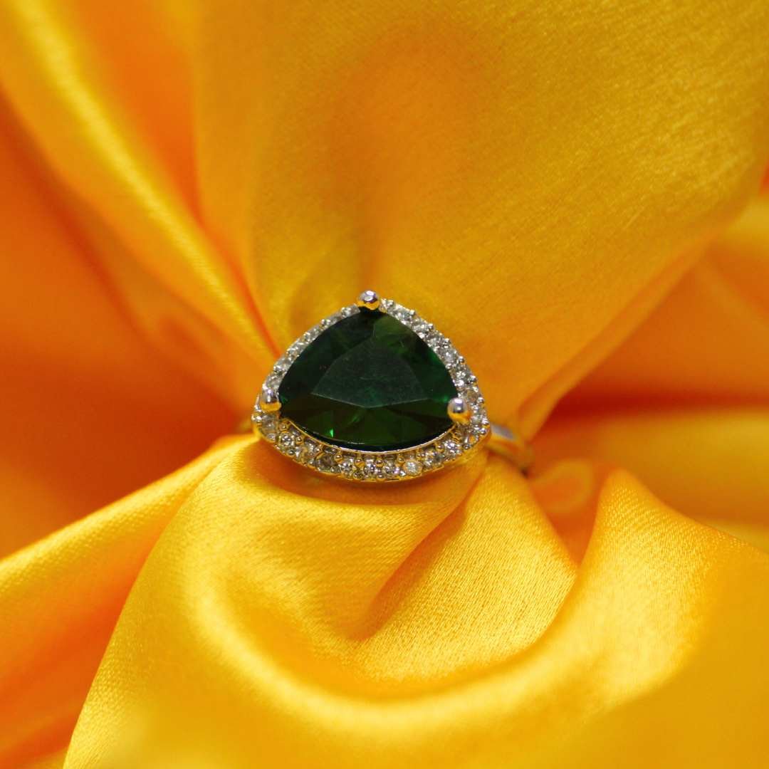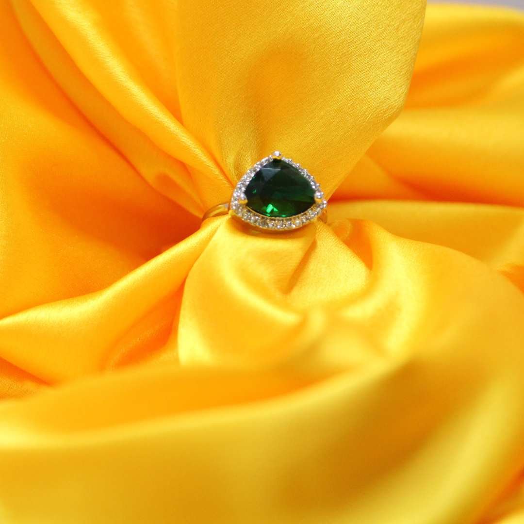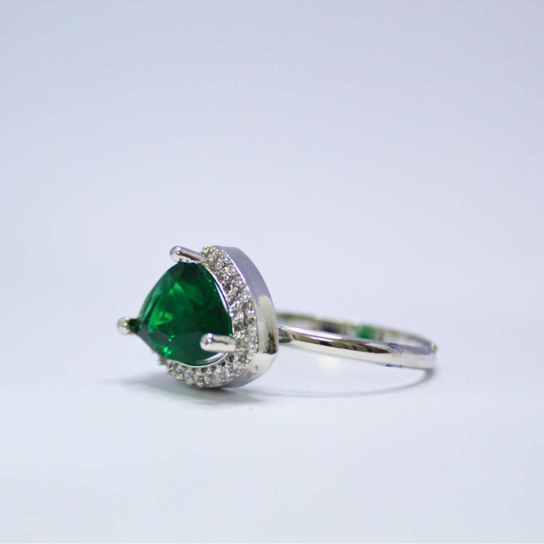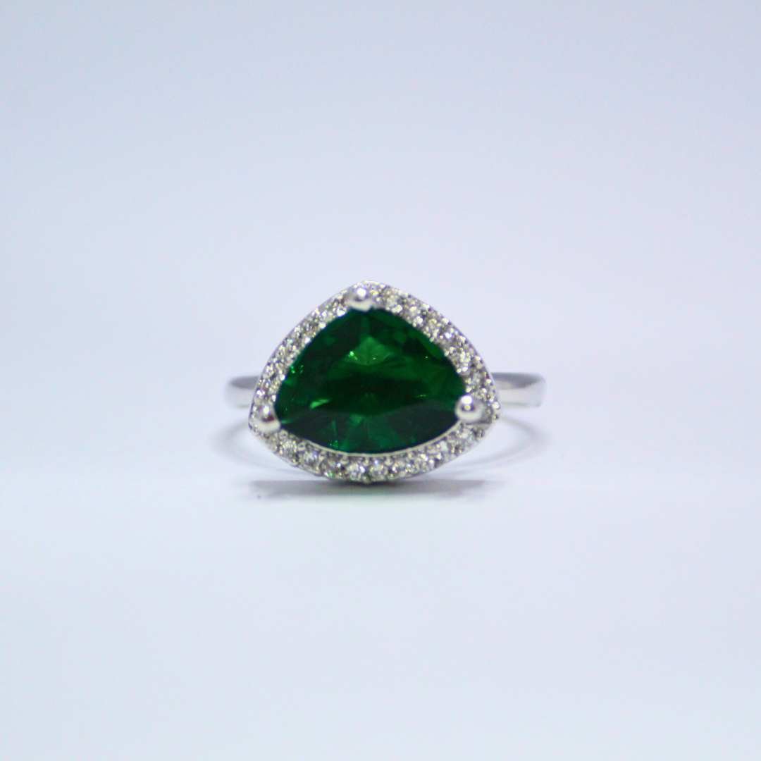 This stunning silver ring features a vibrant emerald green trillion-cut Cubic Zirconia, surrounded by a halo of sparkling diamond accents. The deep green hue of the stone adds a rich, luxurious touch, while the brilliant diamond accents enhance its overall brilliance. Designed for elegance, this ring is perfect for special occasions and offers a timeless charm.