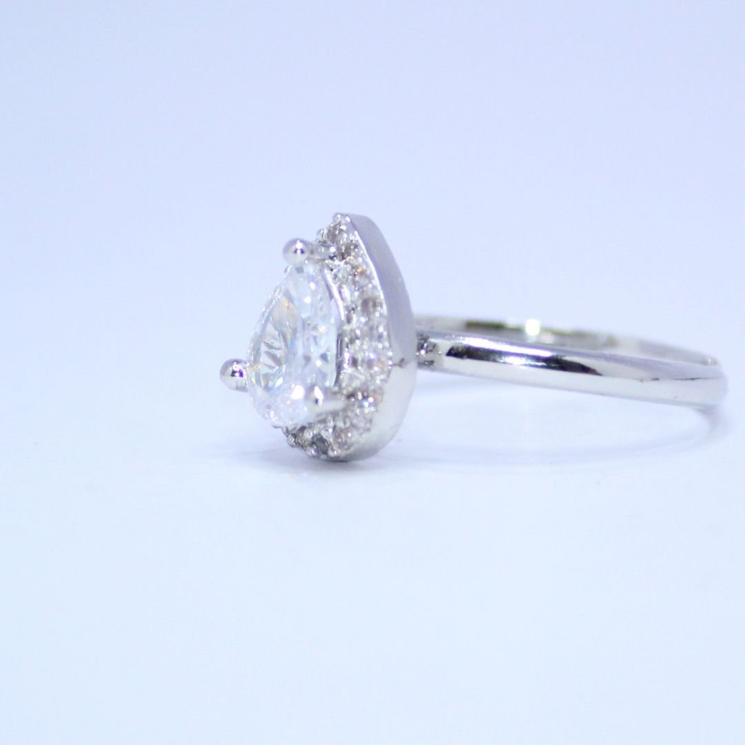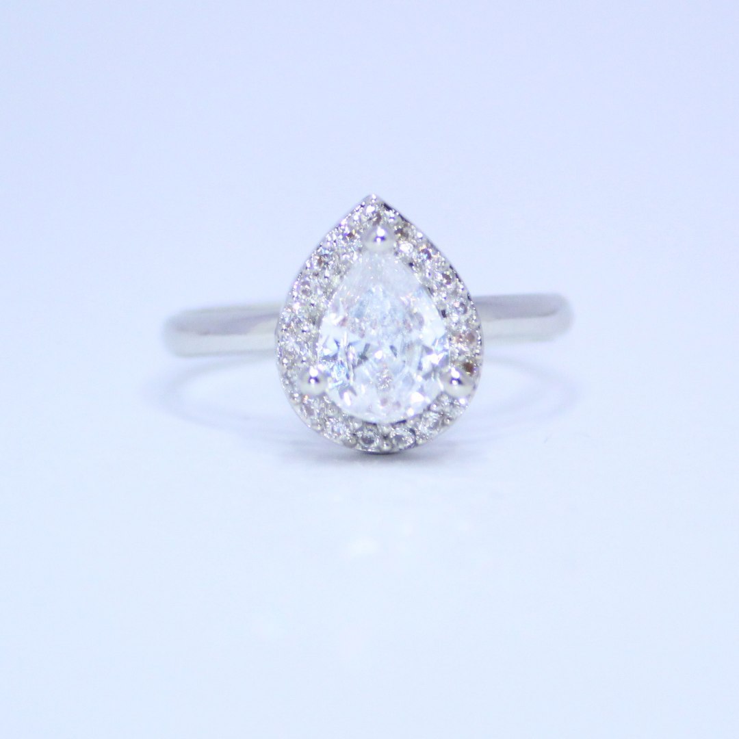 A dazzling teardrop-shaped halo ring set in a sleek silver band, offering timeless elegance and radiant charm. Perfect for special occasions or as a cherished gift.