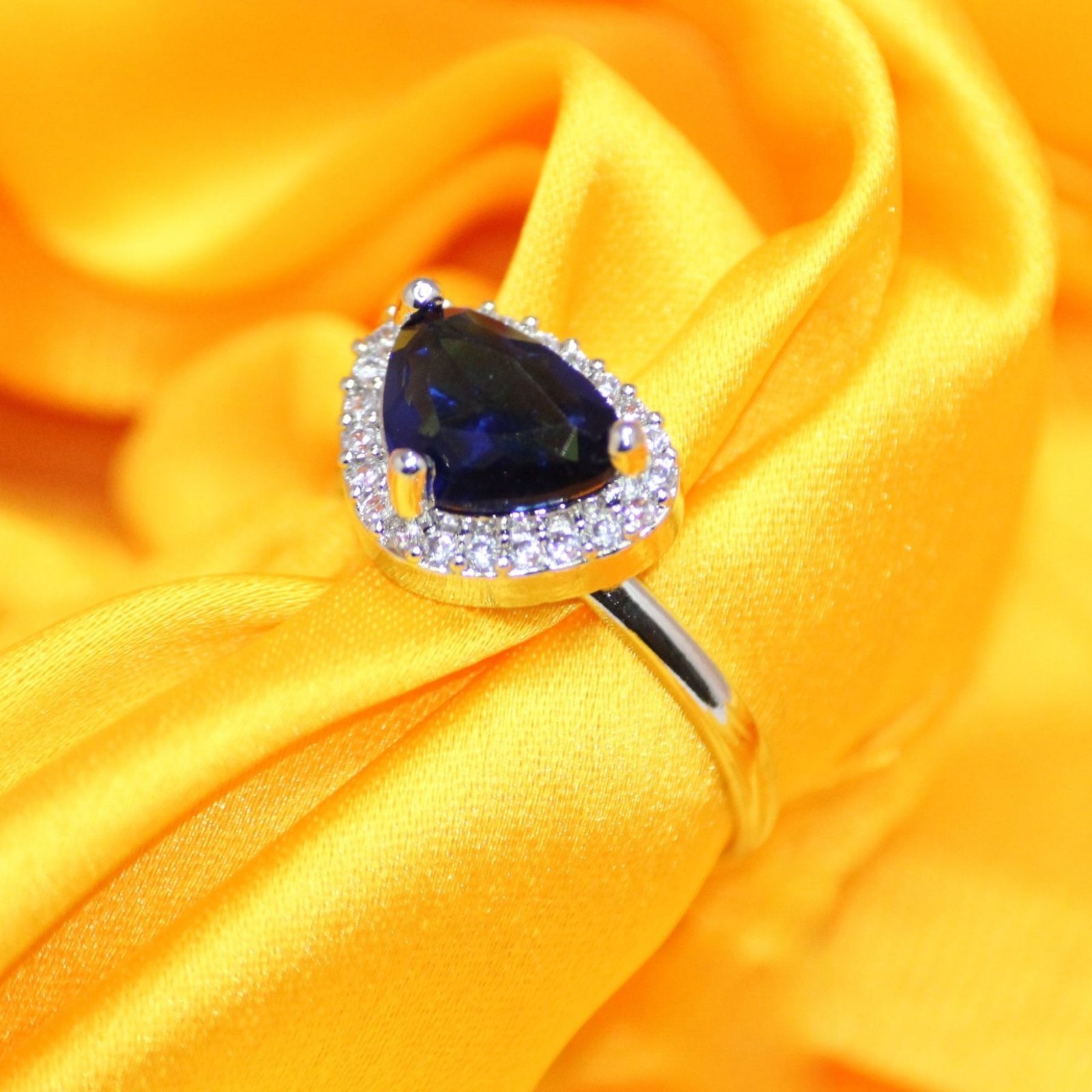 Add a touch of regal elegance to your jewelry collection with this stunning Royal Blue Pear Cut Ring. Featuring a deep blue pear-shaped center stone surrounded by a radiant halo of shimmering accents, this ring is a perfect blend of sophistication and glamour. Its sleek design and timeless charm make it ideal for special occasions, evening wear, or as a statement piece for your everyday look.