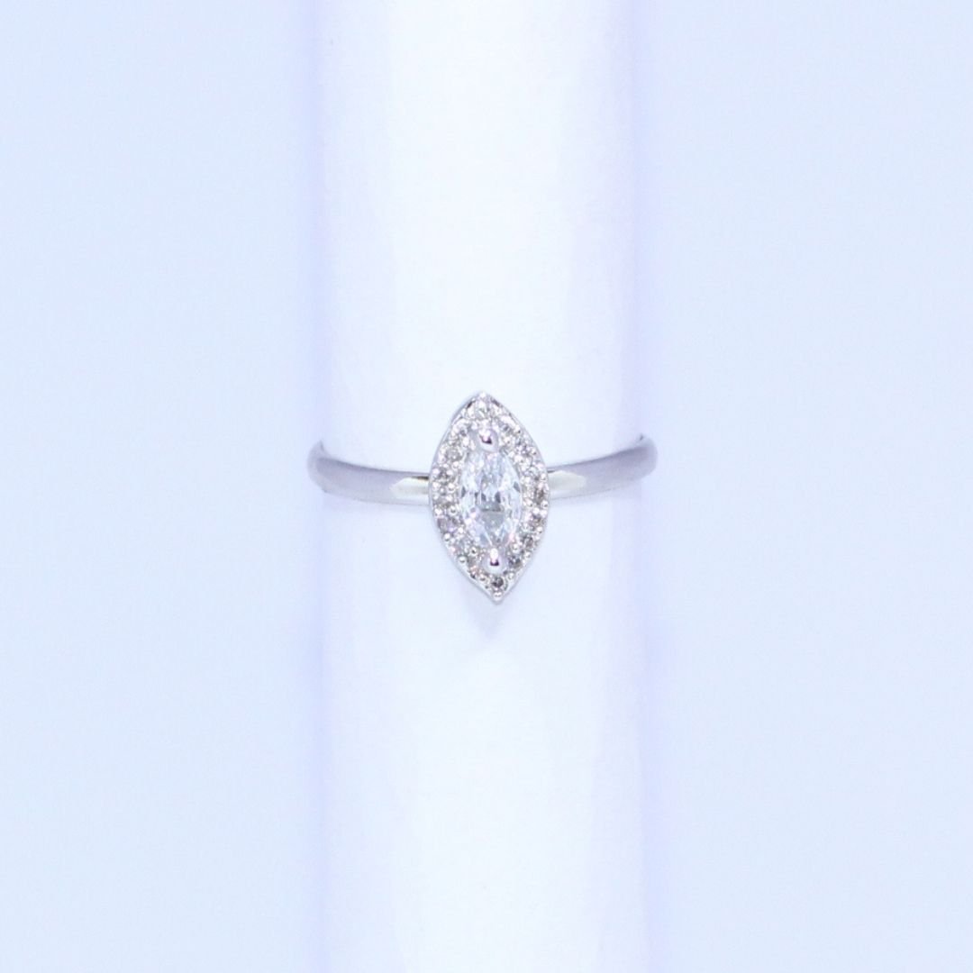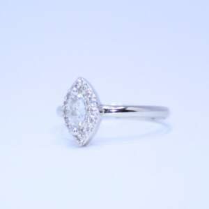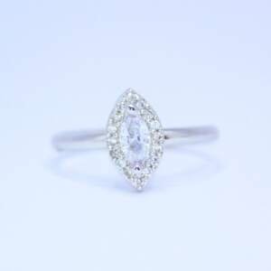 - Brilliant marquise-cut centerpiece with a shimmering halo