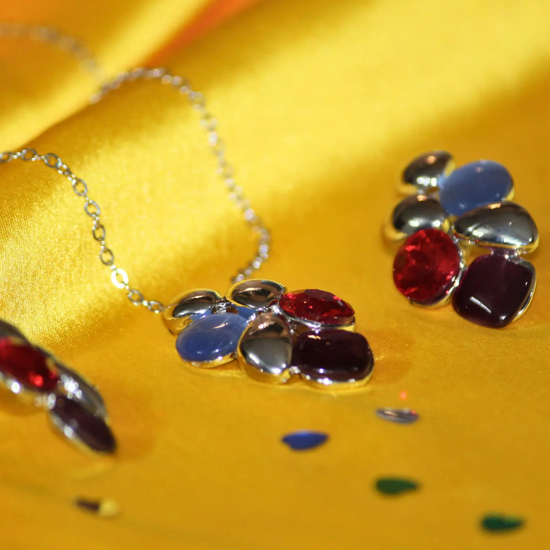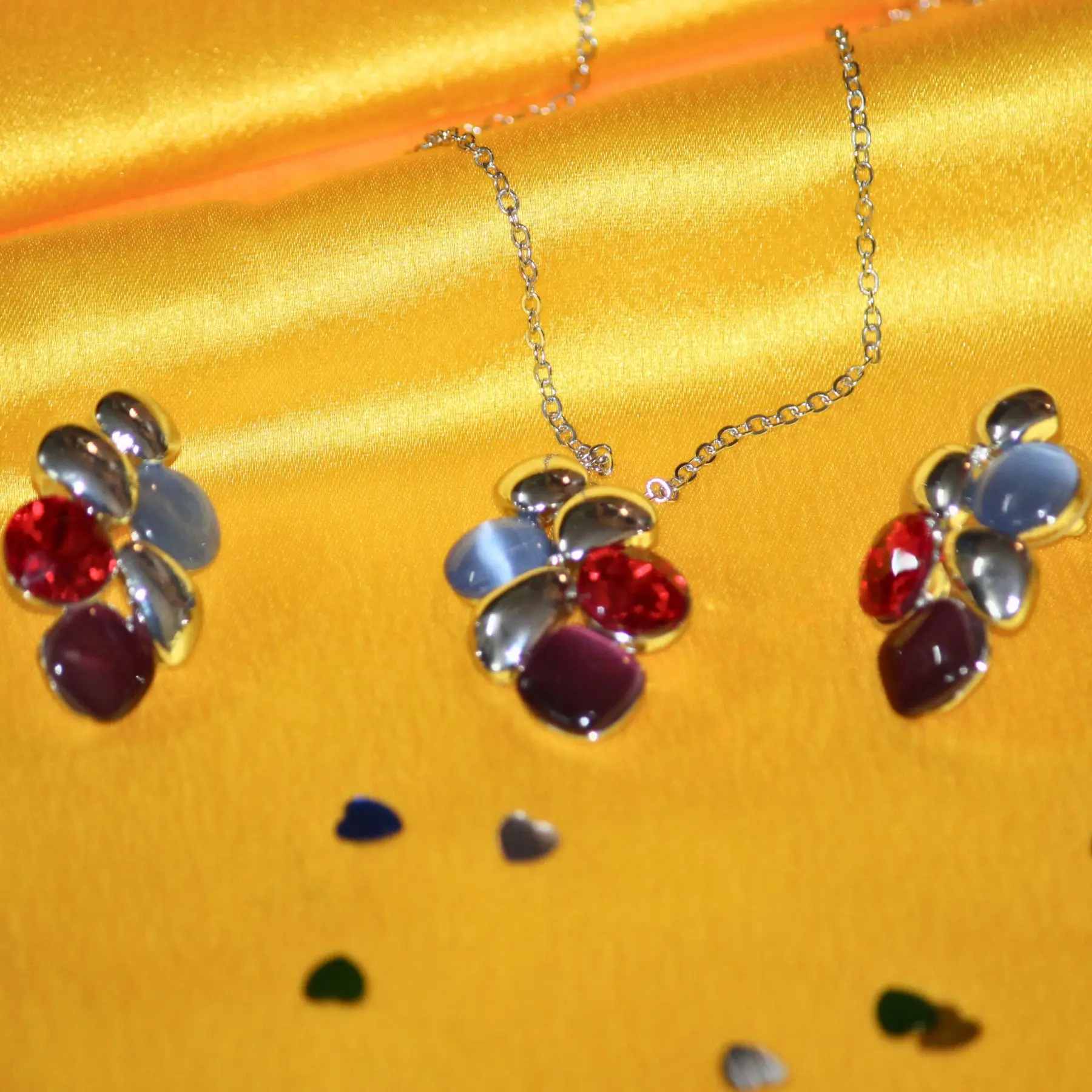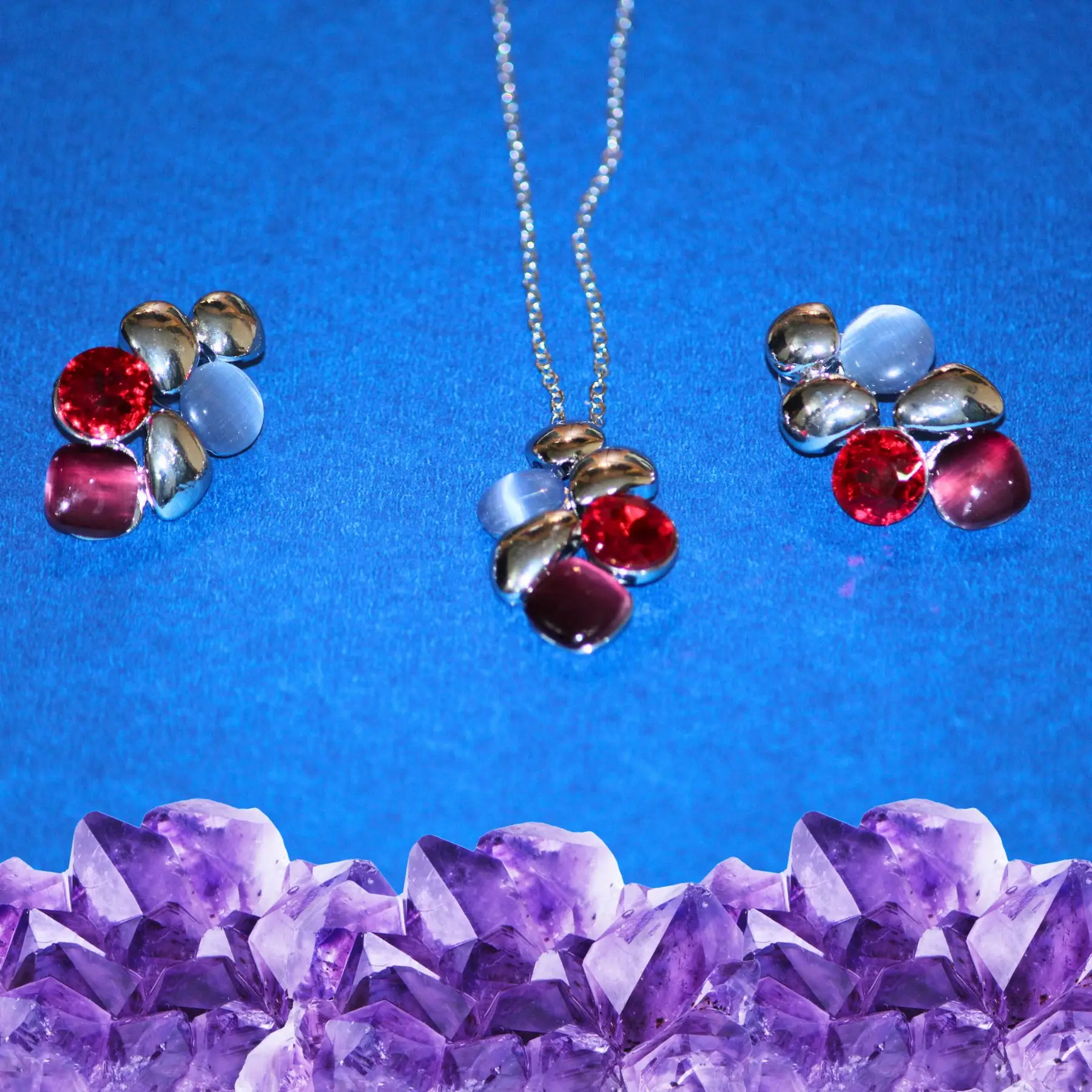 An exquisite fusion of multi-shaped red and light blue crystals with polished metallic accents, the Radiance Bloom Set exudes sophistication and charm.