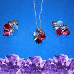 Inspired by nature’s organic beauty, the Radiance Bloom Multi-Shape Crystal Pendant & Earring Set is a luxurious blend of bold hues and modern elegance. Designed with a harmonious arrangement of brilliant red and soft light blue crystals, this set features fluid metallic accents that add a touch of refinement. The unique combination of round, oval, and cabochon-cut stones creates an artistic floral-inspired composition, making it a statement piece for every occasion. Whether worn individually or as a set, this masterpiece is perfect for those who embrace luxury with confidence.