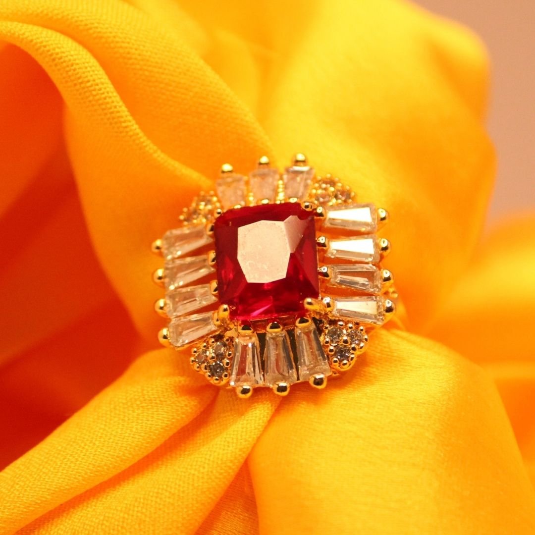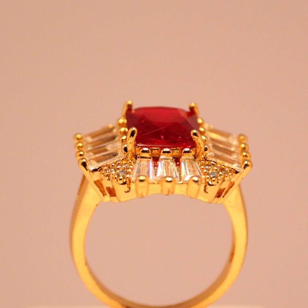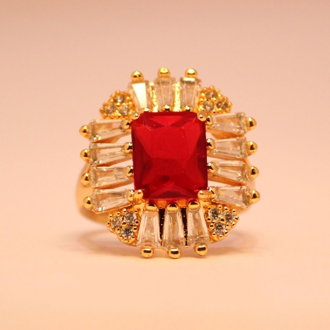 Elevate your style with the striking elegance of the Red Radiance Ring. Featuring a vibrant emerald-cut red centerpiece, this exquisite piece is surrounded by a radiant halo of baguette accents and shimmering stones that amplify its brilliance. The warm gold finish adds a touch of regal sophistication, making this ring a timeless treasure. Perfect for special occasions or as a bold statement accessory, this ring embodies luxury and unmatched craftsmanship.