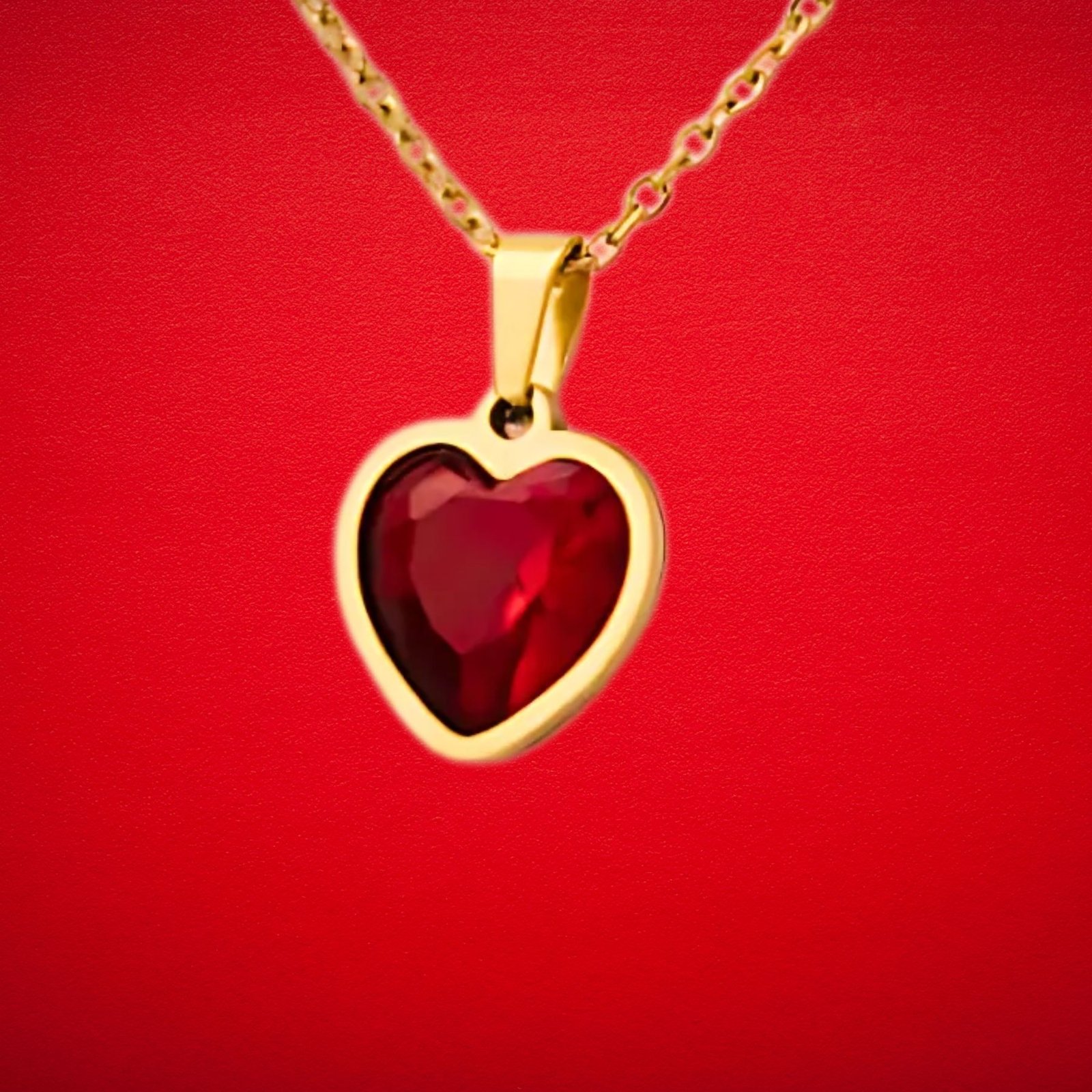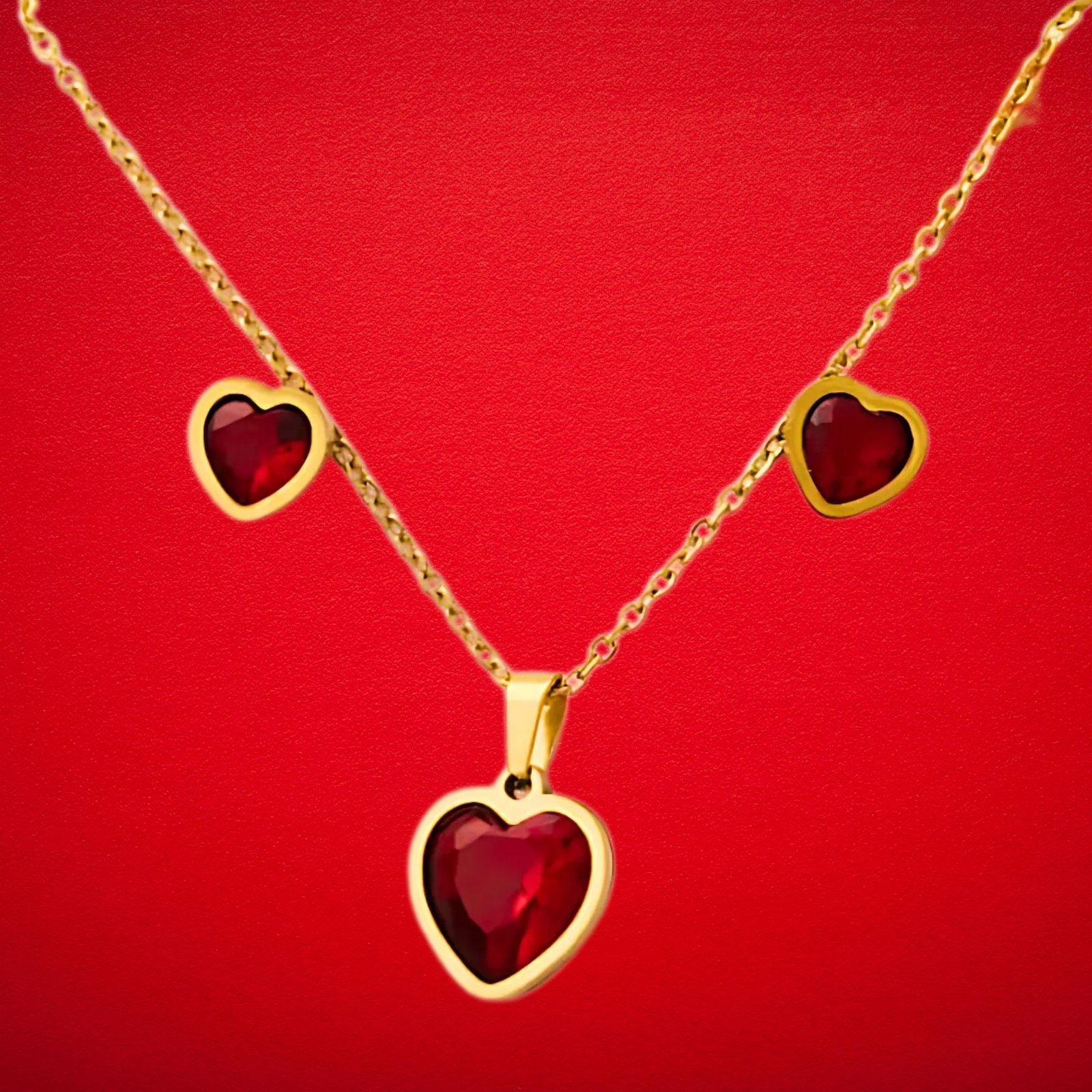 Express your love with this stunning heart-shaped jewelry set. The rich red stones set in lustrous gold-tone frames exude passion and elegance, making this set a perfect statement of romance. Whether worn together or separately, the necklace and earrings add a touch of glamour to your look. Ideal for gifting or elevating your own jewelry collection.